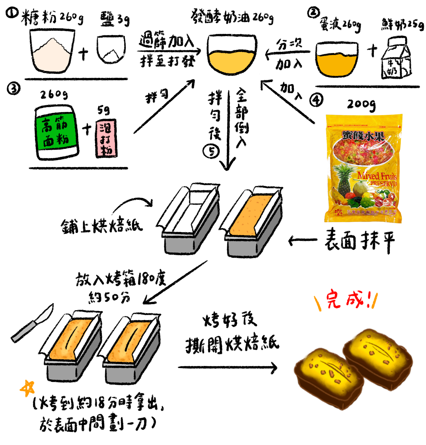 發酵奶油260克糖粉260克鹽3克全蛋260克鮮奶25克高筋麵粉260克(無鋁)泡打粉5克▲蜜漬果150g
